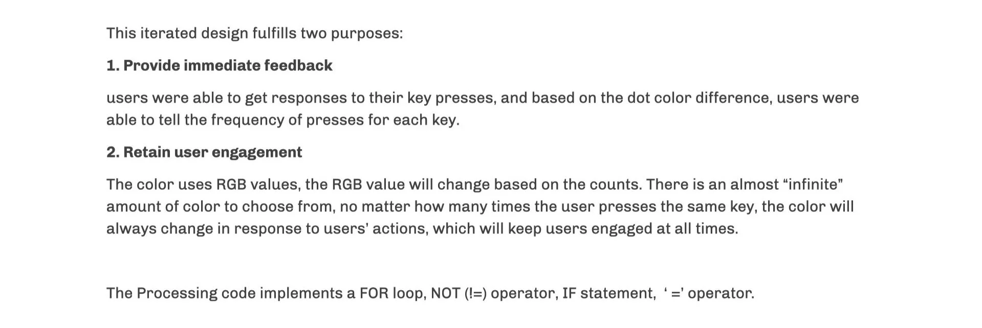 I did quick usability testing with two people, by observing them interacting with the prototype. The two participants both expressed interest when first seeing blue dots on the screen and hearing the sound playing out from the speaker as they press the keys. However, when they pressed the same keys again, they were confused because the screen did not provide any feedback, whereas they have expectations for the dot to perform some sort of actions. After all the keys have been filled with blue dots on the screen, they quit playing with the prototype.